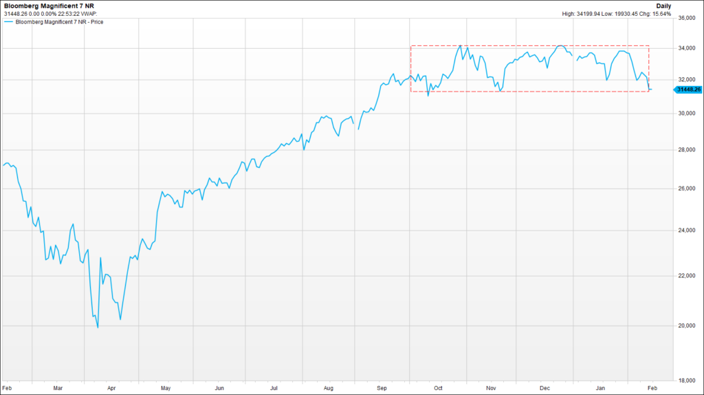 The above chart shows the Bloomberg Magnificent-7 index for the last 12 months, or in other words the performance of an equal-weighted basket of Apple, Microsoft, Alphabet, Amazon, Tesla, Nvidia and Meta Platforms. As we can see these stocks as a basket have not moved at all since September of last year and they have entered into a , what technicians call, “box formation” (red rectangle). Being 6% down for the year, the basket has returned to the support line of this box formation which is crucial for the short-term direction. This type of consolidation can be seen under two different lenses: The bears will point to the loss of momentum and a precursor of a potential breakdown and sharp correction. The bulls will see it as a healthy consolidation phase, which makes the stocks even more attractive, as market capitalizations have remained largely unchanged but profits have been growing in the quarters that have elapsed. We would probably find ourselves in the latter camp as some of the Magnificent-7 are now trading at very attractive valuations vs their history and their recent earning reports are not a cause for alarm. However , owning all seven is probably not the best idea., which means the Nasdaq-100 ETF might not be the optimal Tech-related investment vehicle for 2026, as the above basket is about 50% of the index.